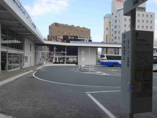 ![]() ▲JR新山口駅北側の防長交通バス乗り場(10:20): 正面がコンフォートホテル新山口 |