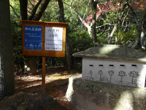 ![]() ▲入寺料200円(任意): 石箱に5個の入金口がありお金を入れると音がする:和の五音鈴 |