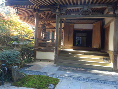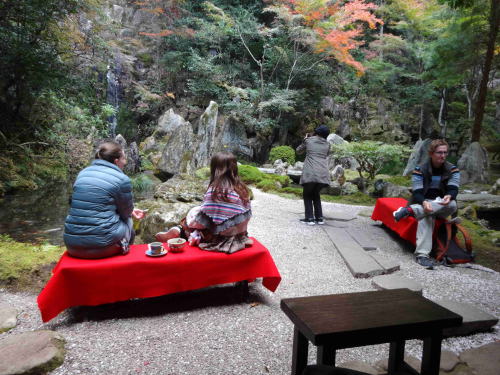 ![]() ▲三滝寺境内の茶堂「補陀洛」で休憩:抹茶(1000円)を飲みながら 正面の滝、紅葉、補陀洛の庭を観る。外人観光客が多い。 |