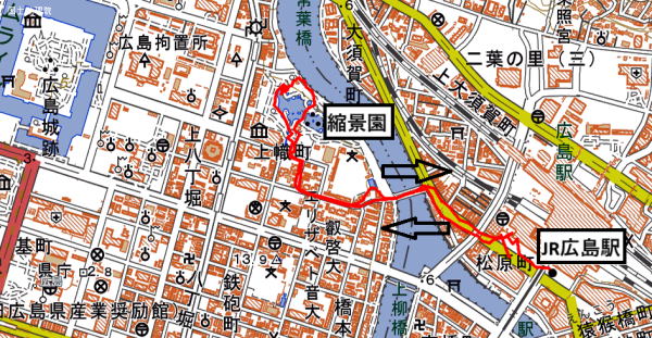 ![]() ▲JR広島駅から北西方向へ歩いて縮景園へ(全歩行距離:2.5km) |