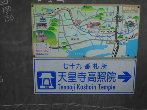 ![]() ▲踏切正面のコンクリート壁面にある天皇寺の道案内図(11:16) |