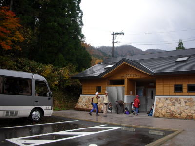 ![]() ▲ 夜明け前に丸亀をバス18名で出発。 約3時間後8:20に岡山県新庄村の登山口に到着する。 ここはビジターセンターで周りは広い駐車場がある。 |