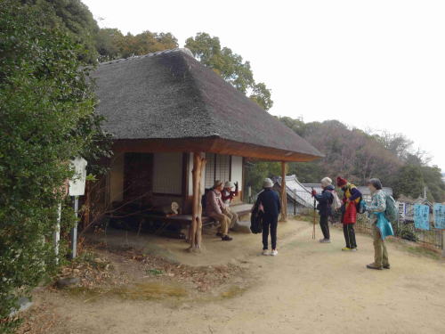 ![]() ▲一夜庵を見学後、小休止(10:20~10:30):一夜庵は俳諧の祖、山崎宗鑑が興昌寺の境内に結んだ庵で日本最古の排跡。建立は享禄元年(1528年)で四度の修復が成されているが、ほぼ原形をとどめている。 |