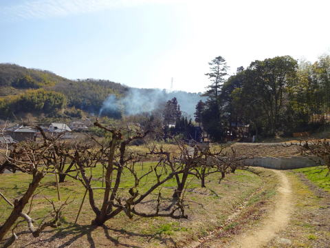 ![]() ▲柿畑の中を恩徳寺へ:のどかな田園風景が広がる |