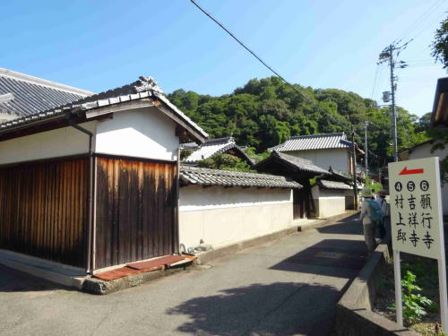 ![]() ▲村上義弘邸跡前の道標(10:10): 正面は村上義弘邸跡(子孫が住んでおり見学は不可) |