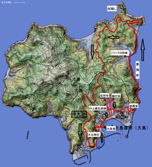 | 天候不順で1日順延した村上水軍の島ウオークに3名が参加しました。 このコースは7年前の2018年2月3日とほぼ同じコースでしたが、観光地のジャックの牧場、パン屋は無くなり、道路整備も十分に行き届いていないようでした。 ただ、美しい海岸、高台からの景色、吉祥寺、願行寺は7年前と変わりなく、また村上義弘邸跡を初めて見ることができました。 午前6時46分にJR宇多津駅で普通電車に乗車し、多度津駅で乗り換えてJR多喜浜駅に8時42分に着き、タクシーでフェリー乗り場の黒島渡船場に9時に到着。 ここでフェリーの乗船時刻を間違えていることが分かり、島での滞在時間を3時間と計画より1時間短くしました。 又、帰りのフェリーを降りてからJR多喜浜駅まで歩かずに路線バスに乗車したので、JR宇多津駅には計画より約2時間早く帰ることができました。 本日のコースとコースタイムは以下の通りです。 JR宇多津駅6:46==6:56多度津駅7:04==8:42JR多喜浜駅8:50==タクシー==9:00黒島渡船場9:40==フェリー(15分)==9:55大島渡し船乗り場……村上義弘邸跡……吉祥寺、願行寺……地蔵堂……ジャックの牧場……舟隠し……本丸跡……大元神社……12:55大島渡し舟乗り場13:05==フェリー(15分)==13:20黒島渡船場……路線バス……13:40JR多喜浜駅13:46==14:31JR観音寺駅14:38==15:18JR宇多津駅 歩行距離:6,6km、休憩、昼食を含む所要時間:3時間、累積標高差:410m |