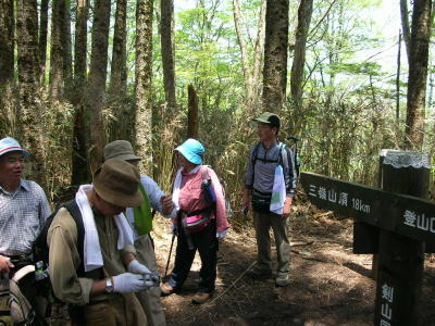 | 日本200名山の一つ三嶺に登る。三嶺はクラブ行事としては4年ぶり。この山は一時期山頂までロープウェイをつける計画が出たりして注目されている山で、祖谷地区の観光開発の勢いを感じる。 以前は林道の奥まで車で入れたが今は名頃の川辺に駐車場が設けられており、登山客でにぎわっている。 今回、下山はいつもと違って菅生(すげおい)登山口に下りる。一部歩きにくい笹の斜面があったが、ちゃんとした林道があり、山野草はこちらの下山ルートに多く咲いていた。なぜか地形図にはこのルートは載っていない。 |