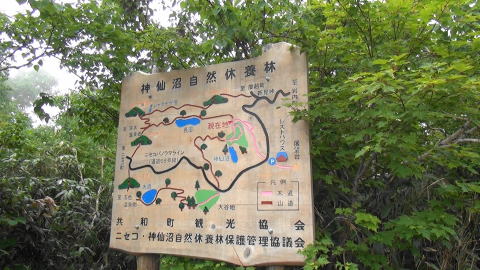 晴れていれば、シャクナゲ岳に登ればチセヌプリやニセコアンヌプリの連山が見える。 予定では神仙沼を巡った後長沼を見て、ビーナスの丘からシャクナゲ岳に登ることにしていたが、当日の天気は曇りで山はガスの中。 ビーナスの丘に着いた時には、近くは見えるが山は全く見えないという状態になり、無理に進んでも見晴らしは期待できないと、残念だったがここで引き返した。 最も人気のある神仙沼の散策はできたので、これであきらめた。 |