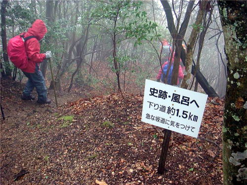 ![]() ▲往路を下山開始 (雨は止んだ:登山口まで1.5kmの標示あり) |