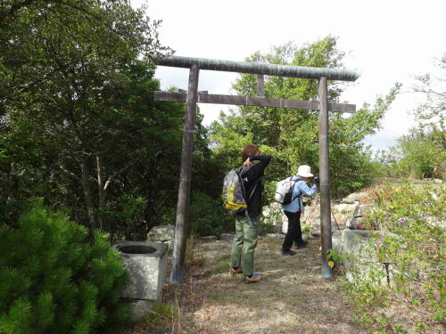 ![]() ▲与治山山頂に到着(10:50):銅製鳥居の上部が山頂で、 壊れた神社建物がある |