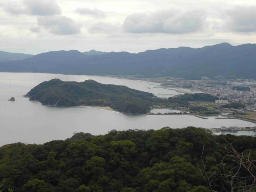 ![]() ▲山頂から見た引田湾と、手前は今年2月に登った引田城跡のある城山 |