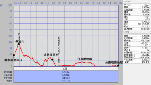 | 16年ぶりの与治山に8名が参加しました。 この数日、天気が不安定で午前中は曇り、午後は小雨で、久しぶりに傘を使用する山行になりました。 与治山下山後に塩越公園でトイレ休憩、与治山公園の遠見展望台で食事をしてから、天然記念物ランプロファイヤーを見学。 その後、JR讃岐白鳥駅の電車乗車時刻の関係で、白鳥動物園を観光しました。 ●16年前に登った与治山は表参道が整備されてなくて、今回は裏参道を往復しました。 急登はありましたが、擬木の階段で歩きやすく高齢者向きのコースでした。 ●天然記念物ランプロファイヤーは満潮時が近く、通行止めで残念ながら観ることは出来ませんでした。 ●白鳥動物園は香川県唯一の動物園で雨にもかかわらず、子供連れの家族を大勢見かけました。 珍しいホワイトタイガーがこの動物園の目玉のようです。 ●後半は傘をさしての車道歩き約9kmで、疲れが出た人もいたようです。 本日のコースとコースタイムは以下の通りです。 JJR丸亀駅7:40==JR宇多津駅7:44==8:29JR高松駅8:33==高徳線==10:01JR讃岐白鳥駅10:05==タクシー(4km)==10:20与治山裏登山道登山口10:30……10:50与治山11:10……11:20裏登山道入り口……12:00塩越公園(トイレ休憩)12:05……12:30遠見展望台(昼食)13:00……ランプロファイヤー岩脈13:20……14:00白鳥動物園(入園料1460円)14:50……15:20JR讃岐白鳥駅15:30==高徳線==17:01JR高松駅17:13==17:37JR宇多津駅17:38==17:41JR丸亀駅 歩行距離:9.3km、歩行時間:3時間5分、 累積標高差(+):460m、累積標高差(ー):540m 休憩、昼食、見学を含む所要時間:4時間50分 |